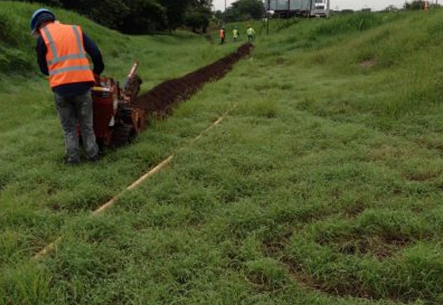 Utilizamos maquinaria de gran porte para efectuar zanjas las cuales establecen un recorrido subterráneo por la cual se pueda transportar la infraestructura necesaria para llegar de un determinado punto a otro. Gracias a la zanjadora la instalación de tuberías y cableado es posible en casi cualquier tipo de terreno con mayor eficiencia y menores tiempos de operación. y otros equipos como mini zanjadora y mini retro excavadora menos invasivas perforadoras horizontales (topo).